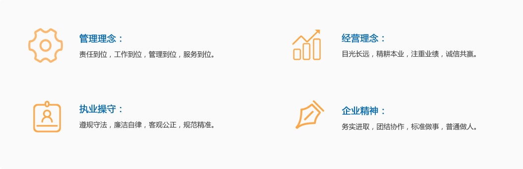 我们的工作之重,就是将精品服务作为企业的核心竞争力并不断强化。每一个服务的细节,都会让标普人全力以赴地去精益求精,务求达到客户最高满意度。以公正的态度和科学的管理实现精品服务,以高质高效的服务实现客户价值最大化。致力于与客户建构稳固的战咯伙伴关系,努力实现让建设工程造福社会的企业使命,这也是标普管理企业之价值所在。公司核心价值观:以社会责任为己任,遵纪守法,奉献社会,报效国家;以客户满意为中心,诚实守信,恪尽职守,优质服务;以员工为企业之本,尊才重教,博采众智,体现人生价值,提高员工工作生活质量;以发展为企业导向,精耕本业,紧跟潮流,追求卓越,创一流品牌。